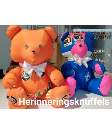 Ken jij deze knuffel al? Een herinneringsknuffel is een knuffel gemaakt uit kleding van een geliefde persoon. Dat kunnen je baby’s eerste kleertjes, pyjama’s zijn. Maar ook bijvoorbeeld je trouwkleed of een communiekleedje…. Maar ook kleding van een geliefde overledene. De knuffel is afgewerkt ongeveer 30 cm hoog en is een blijvende herinnering wat je in je living, keuken, slaapkamer of eender waar kan zetten. Hoe gaat het in zijn werk? Je maakt een afspraak met me, je bezorgt me een aantal kleren waaruit een mooie combinatie gemaakt kan worden. Let wel op dat de kleren zuiver zijn en er geen vlekken opzitten. Het stof moet nog stevig zijn en niet versleten. Liever een beetje teveel kleren, het overschot aan kleren wordt uiteraard terug bezorgt. Een herinneringsknuffel is duurder dan de gewone katoenen versie omdat het samenstellen van de kledingstukken een hele klus is. Bovendien hebben de meeste kledingstukken extra versteviging nodig om te kunnen verwerken tot een knuffel. Zonder deze versteviging verliest de knuffel z'n vorm. De productietijd van een herinneringsknuffel schommelt rond de 3 weken afhankelijk van de heersende werkdruk.